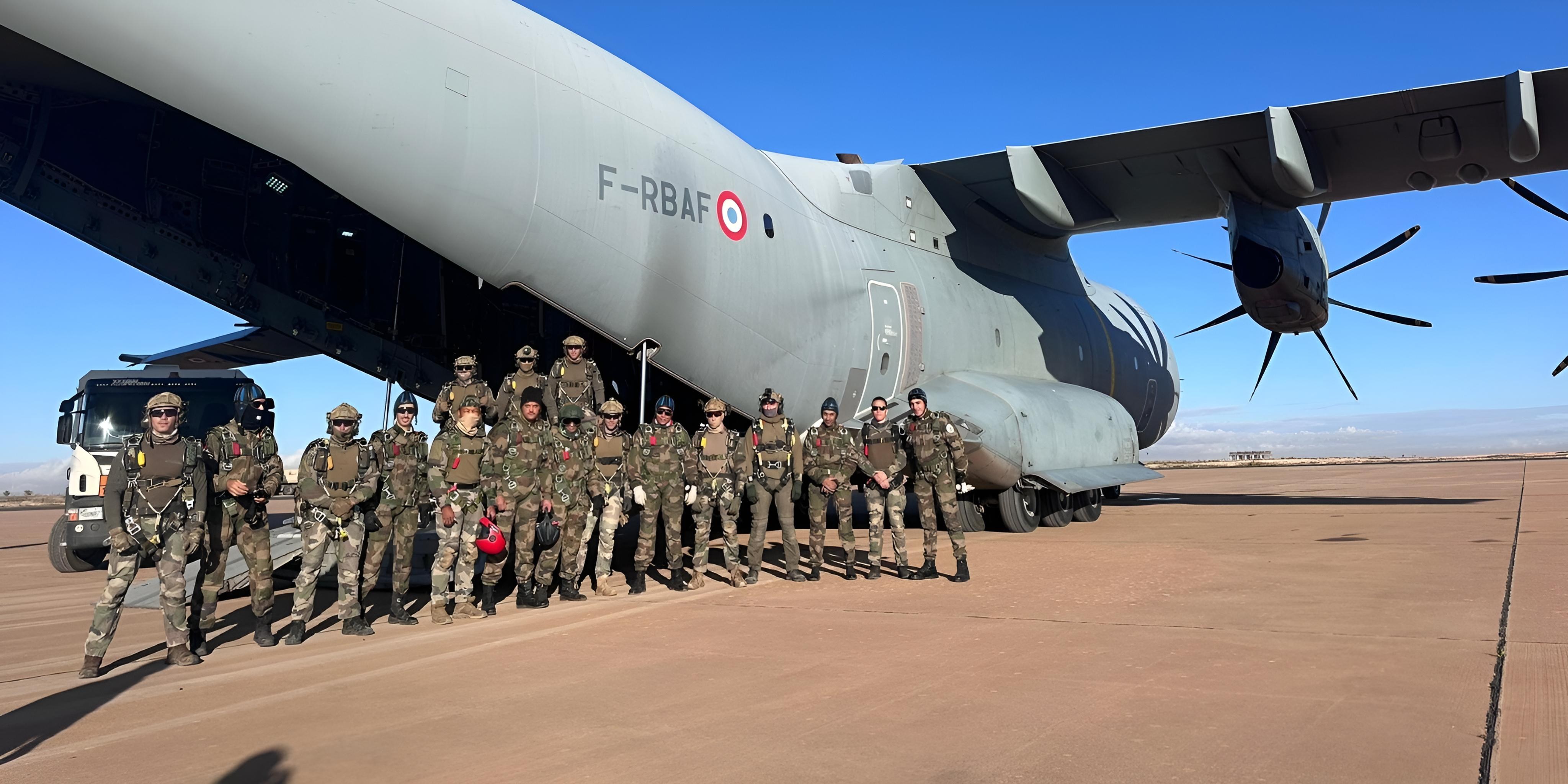 وفي هذا الصدد نفذت القوات المشاركة عمليات قفز مظلي تكتيكي ليلا ونهارا عبر طائرة A400M تابعة لسلاح الجو الفرنسي.
